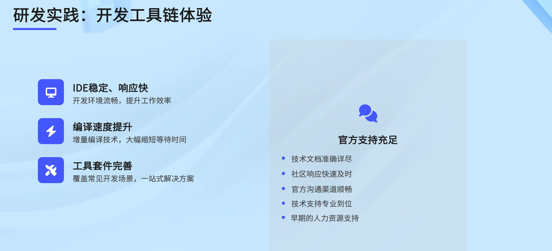 3)开发工具链体验:鸿蒙IDE稳定性强、响应迅速,编译速度大幅提升;工具链覆盖开发、调试、测试全流程,官方文档准确详尽、示例丰富;社区响应快速及时,官方沟通渠道顺畅,技术支持专业到位,早期还提供人力资源支持,这些优势让研发团队上手快,项目推进效率高,交付周期可控。