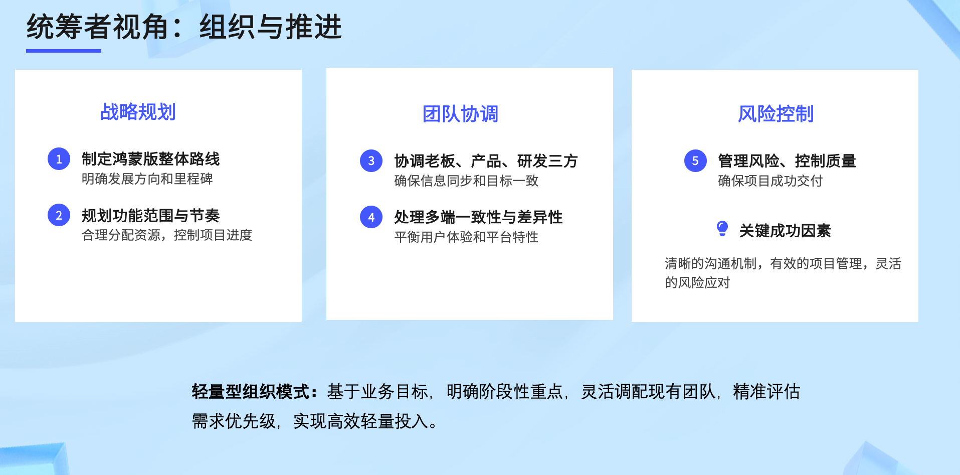 - 设计与测试层面:原有UI设计师负责鸿蒙视觉适配与组件梳理,QA沿用现有团队配置;